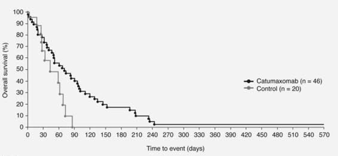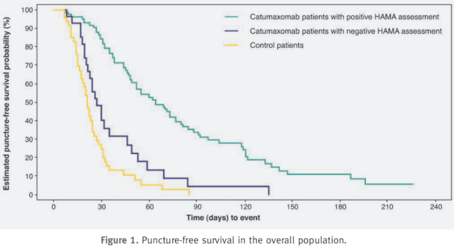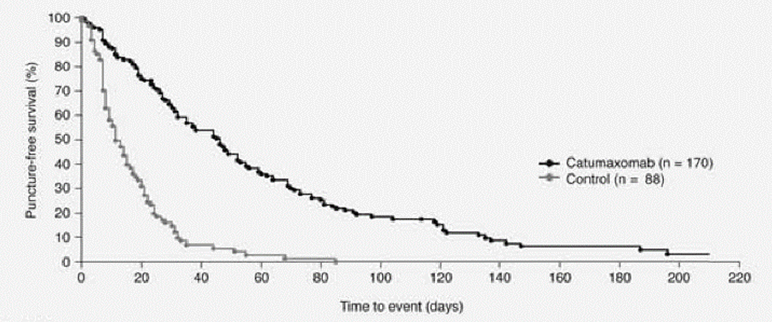 在恶性腹水关键性临床试验中,在欧洲75个临床中心总共入组了258例恶性腹水患者,其中包括卵巢癌(n=129),胃癌(n=66),乳腺癌(n=13),胰腺癌(n=9),结肠癌(n=8),子宫内膜癌(n=6)多类癌症患者。结果显示,卡妥索双抗试验组的中位无腹水穿刺生存期(Puncture free survival, PFS)较对照组显著延长(46天 vs 11天,HR=0.254, p<0.0001),到达了临床主要终点,临床效果非常显著[5]。