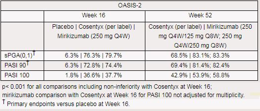 OASIS-2是一项多中心、随机、双盲、安慰剂对照III期研究,比较了mirikizumab、安慰剂、Cosentyx治疗中重度斑块型银屑病患者的疗效和安全性。该研究中,1465例患者以4:4:4:1的比例随机分成以下诱导期和维持期治疗:(a)mirikizumab治疗组1:第0、4、8、12周分别给药一次(250mg),从第16周开始每8周一次(Q8W,250mg);(b)mirikizumab治疗组2:第0、4、8、12周分别给药一次(剂量250mg),从第16周开始Q8W 125mg剂量;(c)Cosentyx治疗组:第0、1、2、3、4周分别给药一次(300mg),从第4周开始每4周一次(Q4W,300mg);(d)安慰剂组:第0、4、8、12周分别给予一次安慰剂,第16-32周每4周给药一次mirikizumab(Q4W,250mg),之后每8周一次mirikizumab(Q8W,250mg)。所有治疗均通过皮下注射给药。