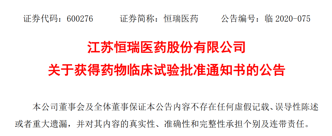 7月20日,恒瑞医药发布公告称,公司及子公司苏州盛迪亚生物医药有限公司、上海恒瑞医药有限公司近日收到国家药监局核准签发的《药物临床试验批准通知书》,并将于近期开展临床试验。