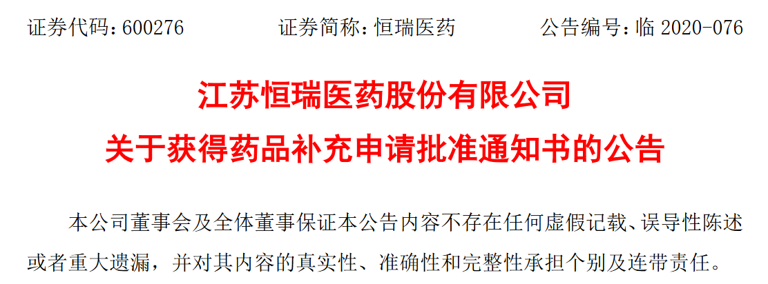 7月20日,恒瑞医药发布公告称,公司近日收到国家药品监督管理局核准签发的《药品补充申请批准通知书》。