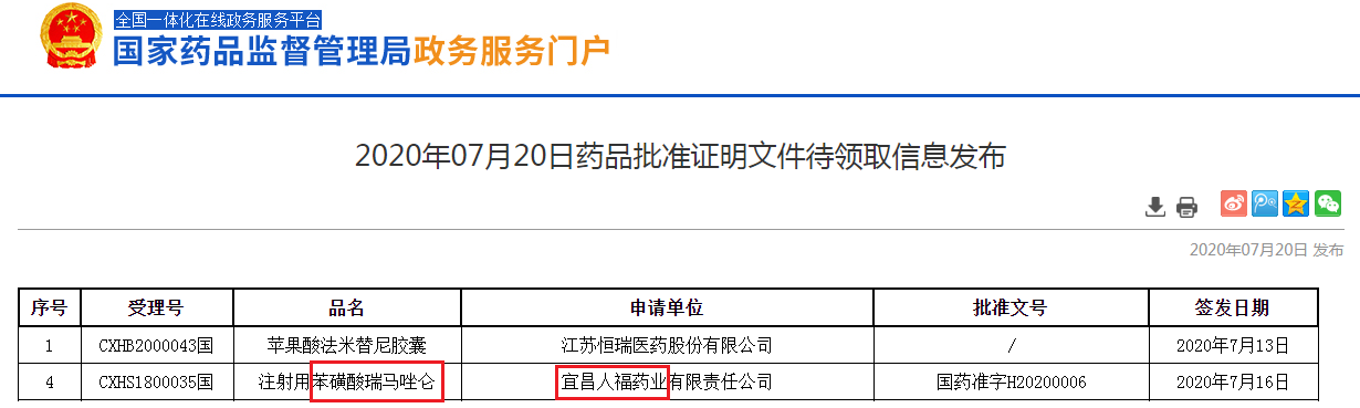 7月20日,根据NMPA药品批件发布通知显示,人福药业的中国1类新药-镇静/麻醉药-注射用苯磺酸瑞马唑仑(Remimazolam)获批准上市(批准文号:国药准字H20200006),此前在今年7月2号,该药在FDA获批准用于诱导和维持接受医疗程序(时长30分钟以内)的成人患者在医疗程序过程中的镇静。