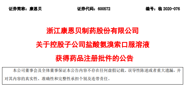 今天,浙江康恩贝制药股份有限公司发布公告称,近日,公司控股子公司浙江康恩贝中药有限公司(以下简称“康恩贝中药公司”)收到国家药品监督管理局核准签发的盐酸氨溴索口服溶液《药品注册批件》。
