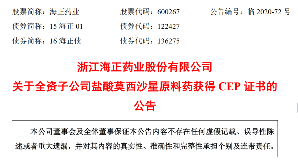 7月22日,海正药业发布公告称,近日,其全资子公司海正药业(南通)有限公司(简称“海正南通公司”)收到欧洲药品质量管理局(EuropeanDirectorate fortheQuality of Medicines&HealthCare,以下简称“EDQM”)签发的盐酸莫西沙星原料药欧洲药典适用性认证证书(Certificate ofSuitability toMonograph of European Pharmacopoeia,以下简称“CEP证书”)。