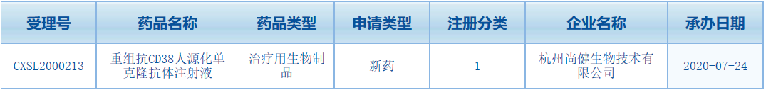 此次尚健生物重组抗CD38人源化单克隆抗体注射液在中国申报临床,是该公司第二款在NMPA递交临床试验的产品。其中,第一款产品重组抗PD-1全人源单克隆抗体注射液已于2018年11月获批临床,它是该公司自主研发的第一个具有自主知识产权的国家1类新药。