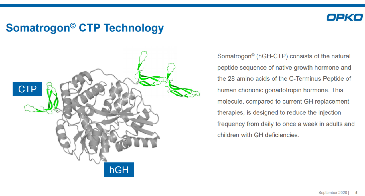 Somatrogon是基于OPKO专有的C末端肽段(CTP)长效技术构成的新分子实体,是在天然生长激素的N末端添加了1个来自人类绒毛膜促性腺激素(HCG)β亚基的CTP拷贝,在C末端添加了2个上述CTP拷贝,达到延长生长激素半衰期的结果。Somatrogon在美国和欧盟均获得了用于治疗儿童和成人生长激素缺乏症的“孤儿药”资格。