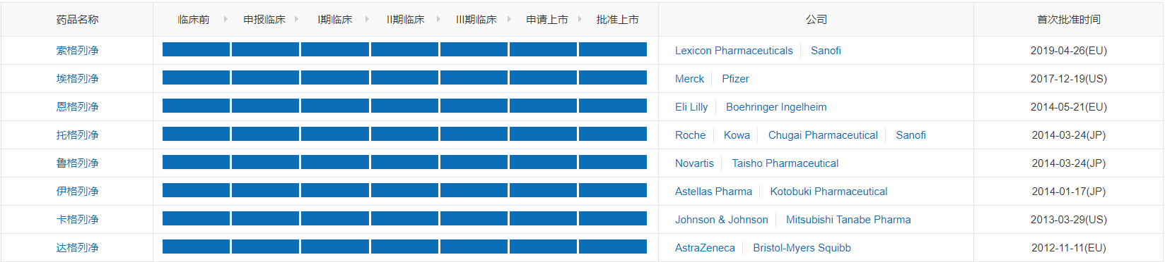 根据医药魔方数据库NextPharma显示,全球目前共有8款SGLT-2抑制剂获批上市,其中,卡格列净(强生)、达格列净(阿斯利康)、恩格列净(勃林格殷格翰/礼来)和艾格列净(默沙东)已经全部在中国获批上市,前3者也已经都通过谈判纳入了2019年国家医保乙类目录。