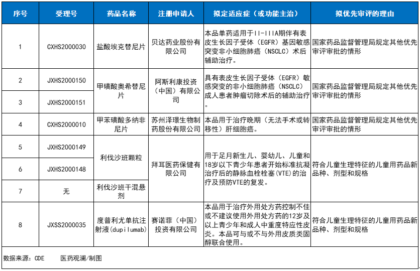 10月12日,中国国家药监局药品审评中心(CDE)网站公示,5款新药上市申请拟纳入优先审评(详见下表)。这些产品分别是贝达药业1类新药埃克替尼,阿斯利康(AstraZeneca)EGFR-TKI奥希替尼,泽璟制药肝癌新药多纳非尼,拜耳(Bayer)抗血栓产品利伐沙班,赛诺菲(Sanofi)"双靶点"抗体度普利尤单抗(dupilumab)。
