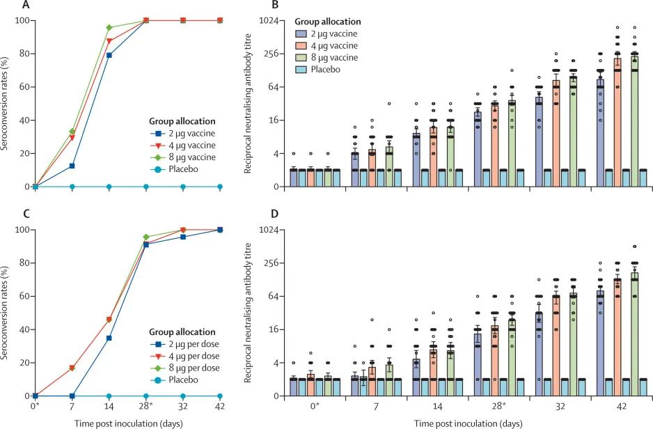 ▲18-59岁和60岁及以上受试者的抗体阳性率(A/C,定义为接种后抗体滴度比基线至少增加四倍)和中和抗体滴度(B/D)(图片来源:参考资料[1])