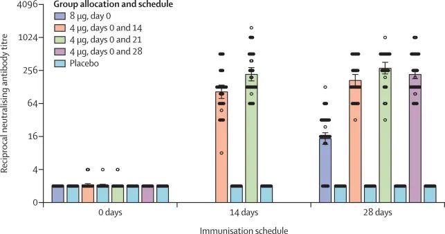 2期试验结果显示,在接种第28天时,两次接种4μg的三组疫苗受试者体内,疫苗引起的中和抗体滴度都显著高于8μg接种一次(14.7),其中0/21天4μg(282.7)和0/28天4μg(218.0)方案的抗体滴度比0/14天(169.5)更高。