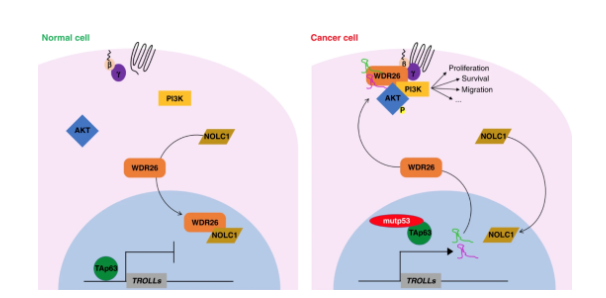 进一步的研究发现,TROLL-2和TROLL-3的肿瘤促进特性依赖于WDR26和穿梭蛋白NOLC1。在缺乏TAP63活性的癌细胞中,TROLL-2和TROLL-3与细胞核中的WDR26结合,阻止了WDR26与NOLC1的相互作用,并导致WDR26从细胞核穿梭到细胞质中。在细胞质中,WDR26刺激AKT信号通路,导致细胞迁移和侵袭增加,促进肿瘤的发展。