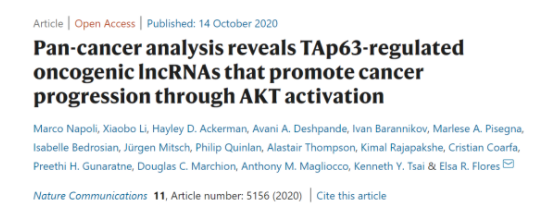 10月14日,在Nature Communications杂志上发表的一篇新文章中,美国Moffitt癌症中心的研究人员确定了通过TAp63调控的lncRNA激活AKT通路的关键机制,并鉴定了两个致癌lncRNA和它们共同的细胞质效应蛋白。这一研究为这些分子作为依赖TP53突变和/或PI3K/AKT通路肿瘤的治疗靶点提供了临床前依据。