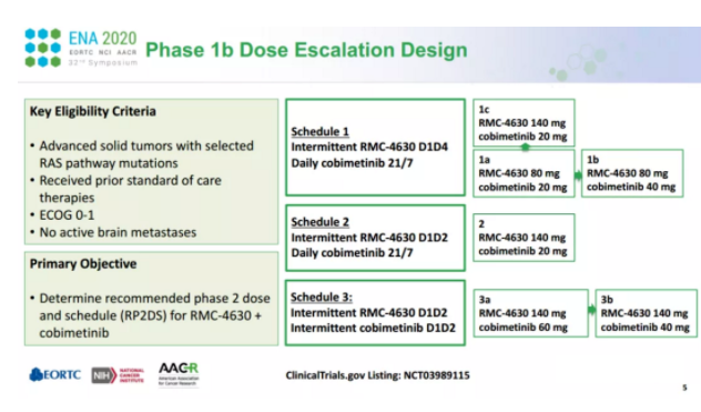 临床前研究显示,RMC-4630与MEK抑制剂联用在RAS突变癌症和具有神经纤维蛋白1(NF1LOF)或BRAFclass3突变缺失的肿瘤模型中具有组合活性。正在进行的Ⅰb/Ⅱ期临床试验(RMC-4630-02,NCT03989115)是一项开放标签的剂量递增和剂量扩展研究,旨在评估RMC-4630和考比替尼联合给药在携带RAS信号通路改变(KRASG12x,KRASamp,NF1LOF,BRAFclass3)成人复发难治性实体瘤患者中的安全性、耐受性、药代动力学和药效学特征。采用RMC-4630每周给药两次(d1、d4或d1、d2)和考比替尼每天给药(21 days on, 7 off)或每周两次(d1、d2)的实验方案。