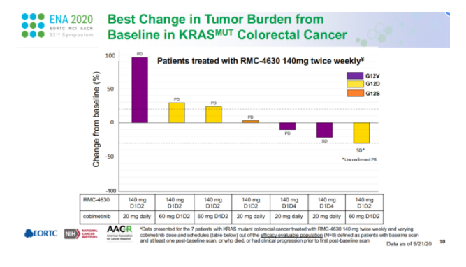 RMC-4630联合考比替尼的药代动力学概况与单药疗法一致,并未检测到药代动力学相互作用。在所测试的所有剂量水平和方案下,暴露量均在导致临床前模型中肿瘤消退的范围内。已在KRASmut大肠癌中观察到初步的抗肿瘤活性证据,7例患者有3例肿瘤减少,包括截止数据时1例未经证实的PR(肿瘤减少范围10%-30%,治疗时间1.9-5.1个月)。