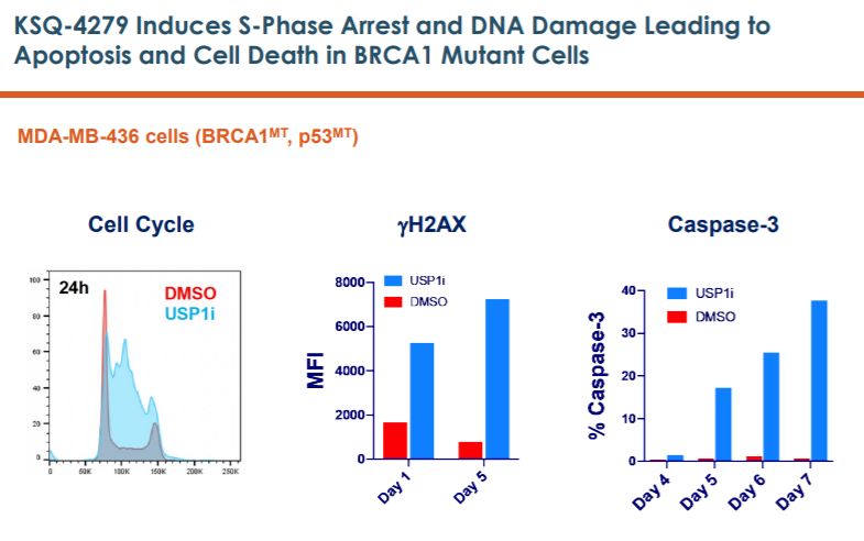 1)在BRCA1突变细胞中,KSQ-4279可诱导细胞周期阻滞和DNA损伤,导致细胞凋亡和死亡(下图)。