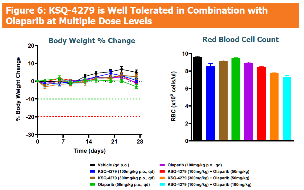 5)初步的安全性数据表明,KSQ-4279作为单药和与奥拉帕尼联合使用都具有良好的耐受性,没有证据表明存在剂量限制血液系统相关毒性(下图)。