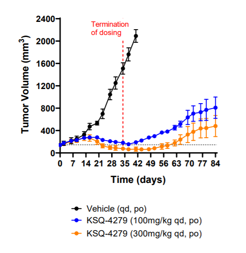 3)在卵巢癌PDX模型中,KSQ-4279单药治疗有效,表现出了剂量依赖性肿瘤生长抑制作用(下图)。