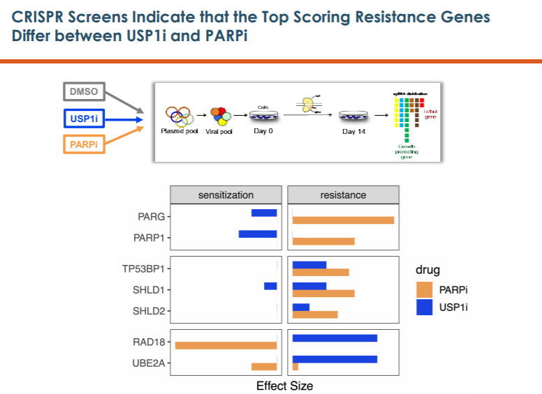 2)功能性基因组耐药筛选表明,USP1抑制剂和PARP抑制剂得分最高的耐药基因不同(下图)。