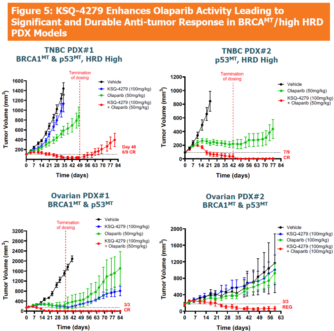 4)在多个卵巢癌和TNBC PDX模型中,KSQ-4279与PARP抑制剂联合使用比单独使用任何一种药物都有更显著的抗肿瘤活性,在PARP抑制剂仅能实现部分肿瘤控制的情况下,联合治疗导致了持久的肿瘤消退,多个肿瘤模型出现CR(下图)。