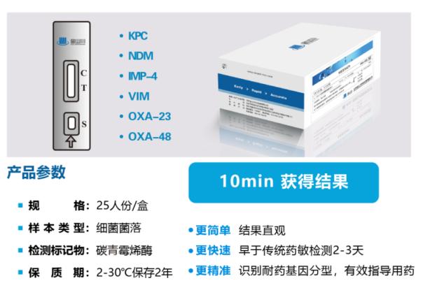 碳青霉烯酶耐药基因检测试剂采用胶体金的检测方法,通过抗原抗体相结合的原理,操作简单,结果直观有效,点样后10 min即可得到检测结果!可有效识别碳青霉烯酶六大基因分型(KPC/NDM/IMP-4 /VIM/OXA-23/OXA-48),有效识别碳青霉烯酶基因分型,创新性引领碳青霉烯耐药感染临床防治新时代!