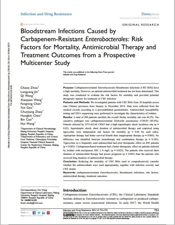 2021年2月,北京大学人民医院王辉教授团队在Infection and Drug Resistance杂志发表了题为《Bloodstream Infections Caused by Carbapenem-Resistant Enterobacterales: Risk Factors for Mortality, Antimicrobial Therapy and Treatment Outcomes from a Prospective Multicenter Study》的前瞻性研究,对我国CRE血流感染的防控与治疗提供重要的参考依据。