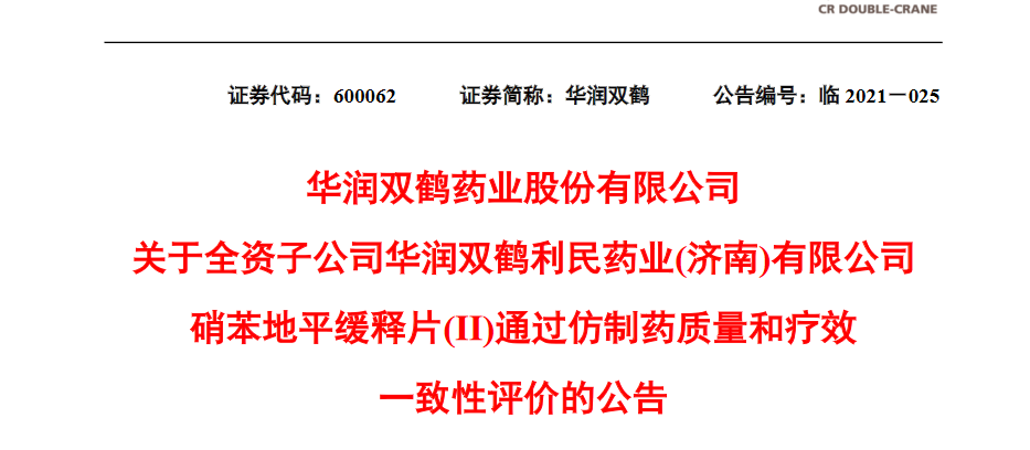 5月7日,华润双鹤发布公告称,子公司收到了国家药监局核准签发的硝苯地平缓释片(II)《药品补充申请批准通知书》,该药品通过仿制药质量和疗效一致性评价。