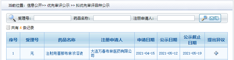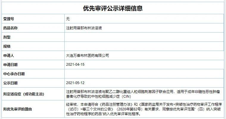 5 月 12 日,NMPA 官网显示,万春药业注射用普那布林浓溶液的上市申请拟纳入优先审评审批,其适应症为:与聚乙二醇化重组人粒细胞刺激因子联合应用,适用于成年非髓性恶性肿瘤患者化疗导致的中性粒细胞减少症(CIN)。该药在中美均已获得突破性疗法认定。