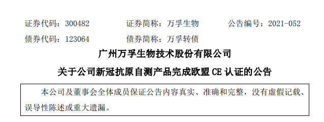 6月3日,万孚生物发公告称,于近期完成新型冠状病毒抗原自测产品的欧盟 CE 认证。
