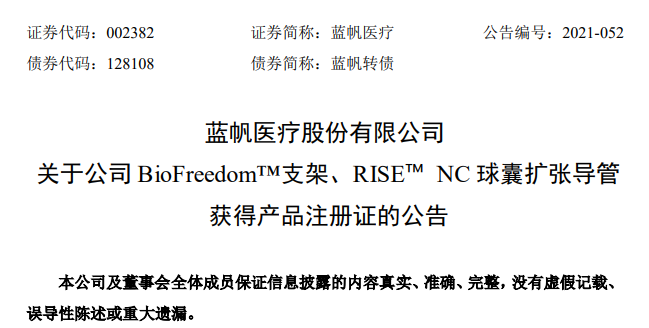 6月24日,蓝帆医疗公告,公司BioFreedom支架、RISE NC球囊扩张导管获得产品注册证。