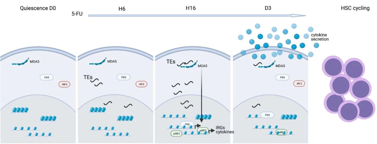 ▲研究示意图:转座元件产生的RNA与免疫受体MDA5结合,引发炎症反应,促使造血干细胞增殖(图片来源:参考资料[1];绘图:BioRender.com)