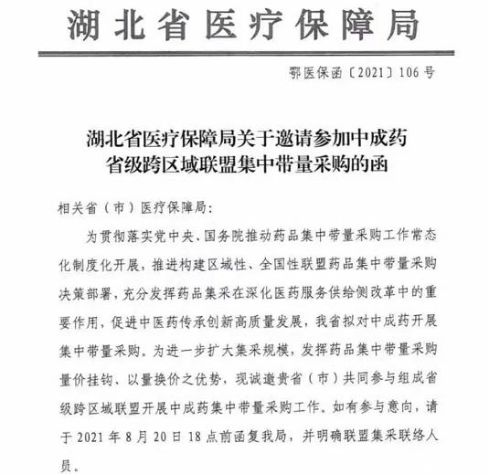 昨日(8月17日),业内流出一份湖北省医保局关于邀请参加中成药省级跨区域联盟集采带量采购的函。
