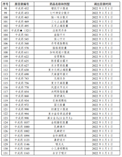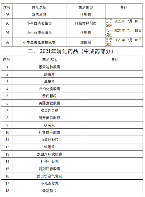 通知中提到,安徽省原省级增补乙类药品共计411个,2020年已经分批消化了166个药品。2021年消化152个药品(其中西药98个、中成药54个)。今年消化的152个药品中,小牛血清去蛋白口服常释剂型、小牛血清去蛋白注射剂、小牛血去蛋白提取物3个药品已于2021年7月18日调出安徽省医保支付范围,其余149个药品将于2021年12月31日前调出安徽省基本医疗保险、工伤保险和生育保险药品目录以及门诊慢性病药品目录范围。