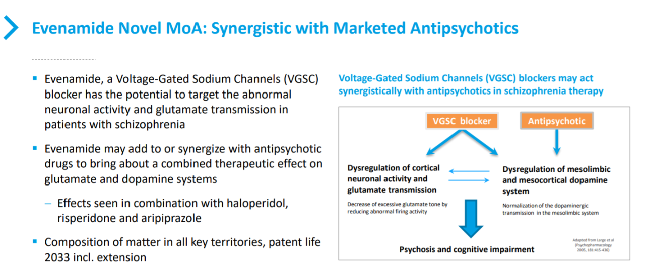 在一项2a期临床研究中,与安慰剂相比,在两种最常用的处方非典型抗精神病药物的基础上加用evenamide可显著改善精神病症状。该研究还表明,evenamide对大多数抗精神病药物靶向的超过130种神经递质、酶或转运蛋白均无影响。在约200例健康志愿者和精神分裂症患者中进行的其他研究达到了所有剂量的安全性目标。