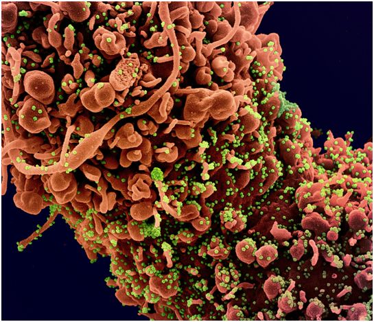 从美国患者身上分离出的新型冠状病毒感染症(导致COVID-19的冠状病毒)SARS-CoV-2的透射电子显微镜图像显示,在实验室培养的细胞表面出现了病毒颗粒。冠状病毒的名字来源于病毒颗粒外边缘的冠状刺突。图片来自NIAID-RML