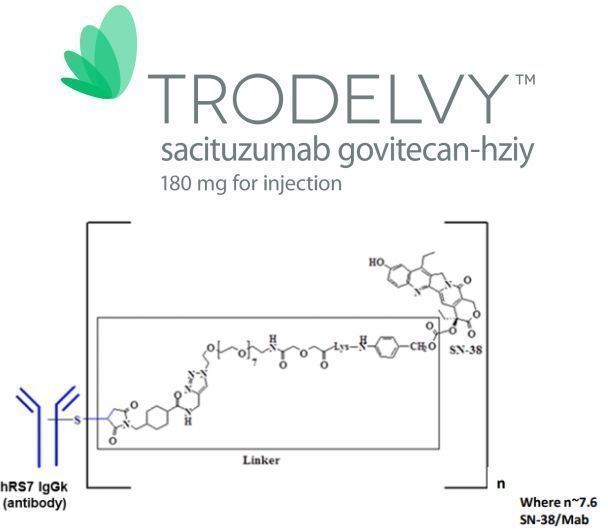 Trodelvy是一款靶向Trop-2的新型、首创的抗体偶联药物(ADC),由靶向TROP-2抗原的人源化IgG1抗体与化疗药物伊立替康(一种拓扑异构酶I抑制剂)的代谢活性产物SN-38偶联而成,药物-抗体比高达7.6:1。Trop-2是一种在许多上皮性肿瘤(包括TNBC)中频繁表达的细胞表面蛋白,在90%以上的TNBC中表达。Trodelvy与Trop-2靶向结合并递送抗癌制剂SN-38来杀死癌细胞。