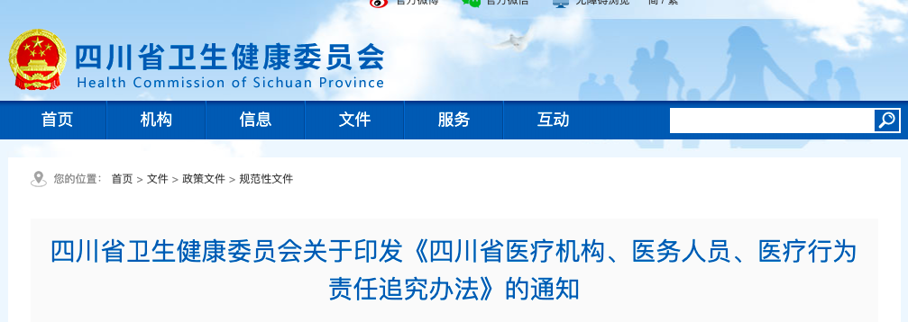 近日,四川省卫生健康委员会印发《四川省医疗机构、医务人员、医疗行为责任追究办法的通知》(以下简称《办法》)。加大了对不合法、不合理的医疗行为实施问责追责。