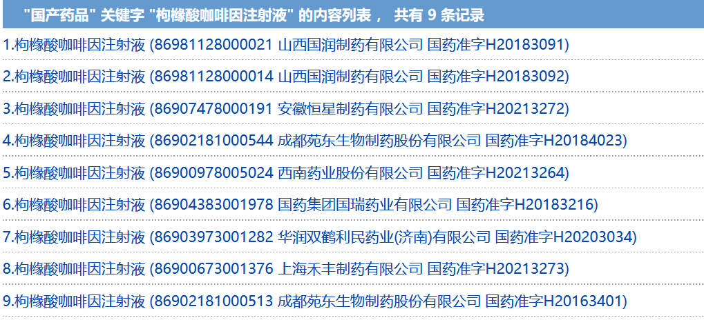 赛柏蓝在国家药监局官网查询发现,关于枸橼酸咖啡因注射液的信息有9条,涉及国药集团国瑞药业、华润双鹤利民药业(济南)、西南药业、山西国润、安徽恒星、成都苑东6家知名药企。