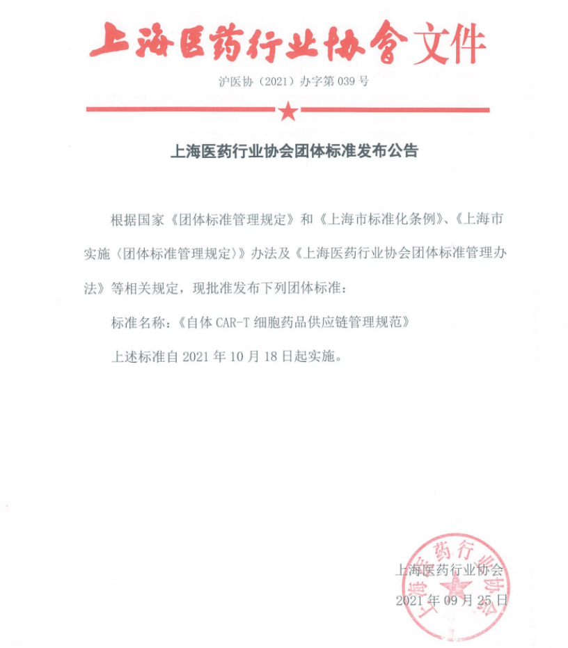 2021年10月13日,全国团体信息平台发布了由上海医药行业协会和上海药品审评核查中心组织起草的《自体CAR-T细胞药品供应链管理规范》(T/SHPPA 011—2021)团体标准,该标准2021年10月18日起实施。此《自体CAR-T细胞药品供应链管理规范》团体标准规定了自体CAR-T细胞药品供应链管理要求,包括自体CAR-T细胞药品供应链中MAH及相关方的职责、数字化信息平台、设施设备、物流运作、供体材料和自体CAR-T细胞药品运输、自体CAR-T细胞药品的储存、自体CAR-T细胞药品交付、异常情形处理、召回、不合格品处置、文件记录等,弥补了国内自体CAR-T细胞药品供应链管理规范技术要求和检验领域的空白。