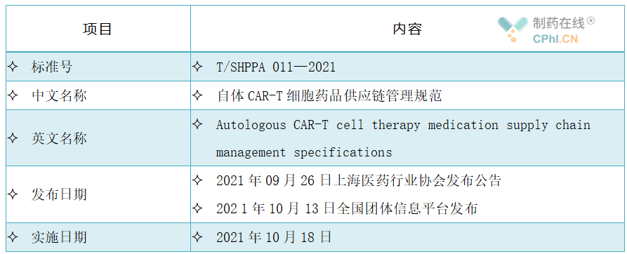 二、《自体CAR-T细胞药品供应链管理规范》标准信息