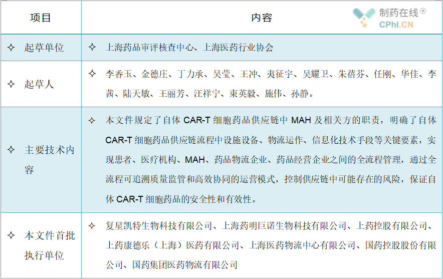 三、《自体CAR-T细胞药品供应链管理规范》起草单位、起草人和主要技术内容