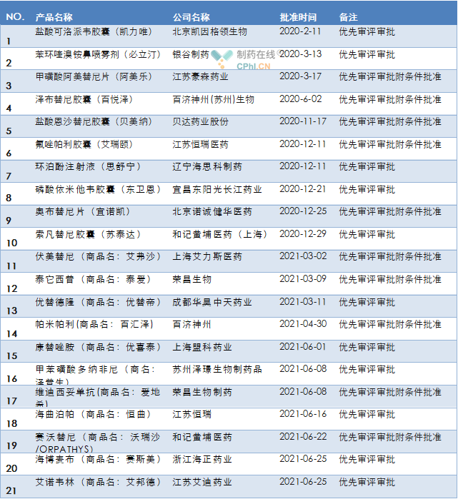 近年来,国内自主创新的新药申报和批准数量持续增加,据不完全数据统计, 2020年NMPA批准了10款国内创新药, 2021年至今NMPA批准了11款国内创新药(截止至2021年9月)(详见表1)