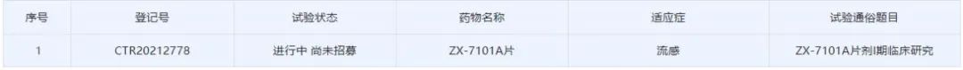中国药物临床试验登记与信息公示平台显示,南京征祥医药有限公司(以下简称“征祥医药”)在中国启动了一项ZX-7101A片剂的1期临床研究。ZX-7101A是一款针对甲型流感和乙型流感病毒RNA聚合酶(PA)的新型小分子抑制剂,具有广谱抗流感药效。本次启动的临床试验由复旦大学附属华山医院张菁教授和复旦大学附属华山医院张文宏教授担任主要研究者。