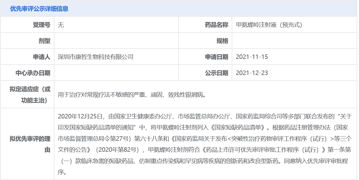 中国国家药监局药品审评中心(CDE)最新公示,康哲药业引进的甲氨蝶呤注射液(预充式)以“临床急需的短缺药品、仿制重点传染病和罕见病等疾病的创新药和改良型新药”为由,被拟纳入优先审评,拟用于治疗对常规疗法不敏感的严重、顽固、致残性银屑病。不久前,该产品的注册上市许可申请已获得CDE受理。
