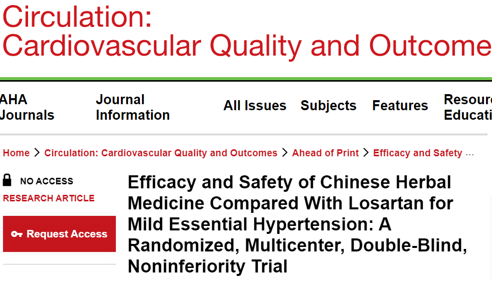近日,美国心脏病协会AHA官方期刊Circulation子刊(Circulation: Cardiovascular Quality and Outcomes,中科院分区2021升级版,医学一区Top)在线刊载了题为“Efficacy and Safety of Chinese Herbal Medicine Compared With Losartan for Mild Essential Hypertension: A Randomized, Multicenter, Double-Blind, Noninferiority Trial”的临床研究论文,中医药治疗原发性高血压添高质量临床证据,成果获国际权威期刊认可。