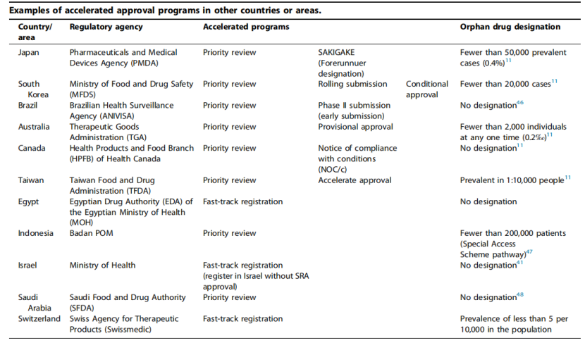此外,韩国允许申请人在滚动申请的基础上按监管要求分模块提交数据。巴西和台湾可以受理基于替代终点或II期研究数据提交的上市申请并做出附条件批准。需要指出的是,获得孤儿药资格在日本可以普遍享受优先审评,这与美国和欧盟的孤儿药通道并不相同。