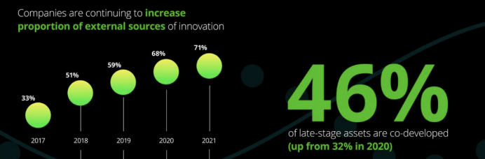 延续过去几年的趋势,创新特别是后期管线的创新研发越来越多的来自于企业外部。值得注意的是,2021年共同研发的后期管线比例从 2020 年的 32% 增加到 2021 年的 46%,这意味有近一半后期管线正在通过共同合作进行开发。