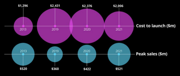 另外15家企业共拥有242向后期管线,平均每家公司拥有管线的数量达到了16.1个,这也是2013年以来的最高值。也正是由于后期管线数量的增多在数据上带来了2021年生物医药企业研发的平均成本略微降低至20 亿美元。虽然平均值下降,不过2021年要想开发一款新药至少也需要8.42亿美元,最高则可能高达50.34亿美元。