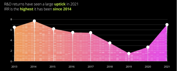 近日,德勤发布了第12份年度报告。报告分析了15家全球领先的生物制药公司2021年的研发回报趋势,新冠大流行对研发管线的影响以及其是如何改变药物研发范式的 ,报告涉及生物制药公司2021年药物创新的平均内部收益率 (IRR) 都有了不小的提高。