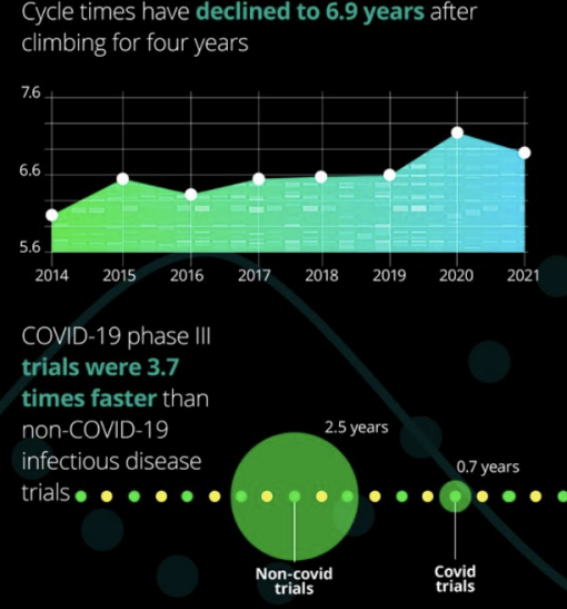 2021年生物制药研发的平均周期,从 2020 年的 7.14 年降至 6.9 年,自 2016 年以来首次出现同比下降。新冠病毒疗法和疫苗的临床试验比非新冠的常规药物临床快了3.7倍。