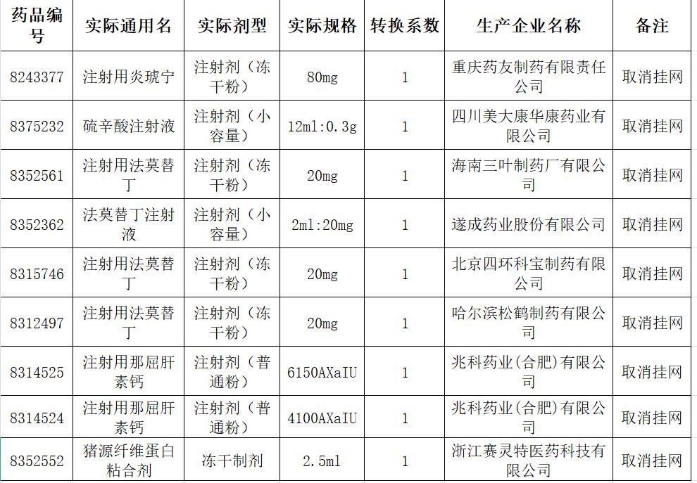 经梳理,重庆药友制药、四川美大康华康药业、海南三叶制药厂、遂成药业、北京四环科宝制药、哈尔滨松鹤制药、兆科药业(合肥)、浙江赛灵特医药这8家企业的9个产品被取消挂网。涉及到的产品主要有注射用炎琥宁、硫辛酸注射液、注射用法莫替丁、注射用那屈肝素钙等。