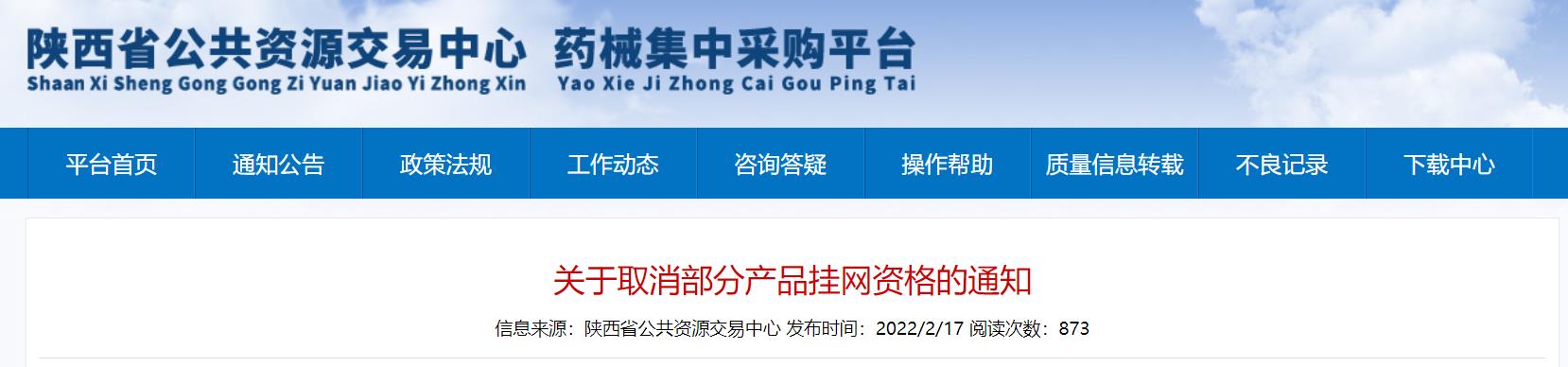 2022年2月17日,陕西省公共资源交易中心发布关于取消部分产品挂网资格的通知。